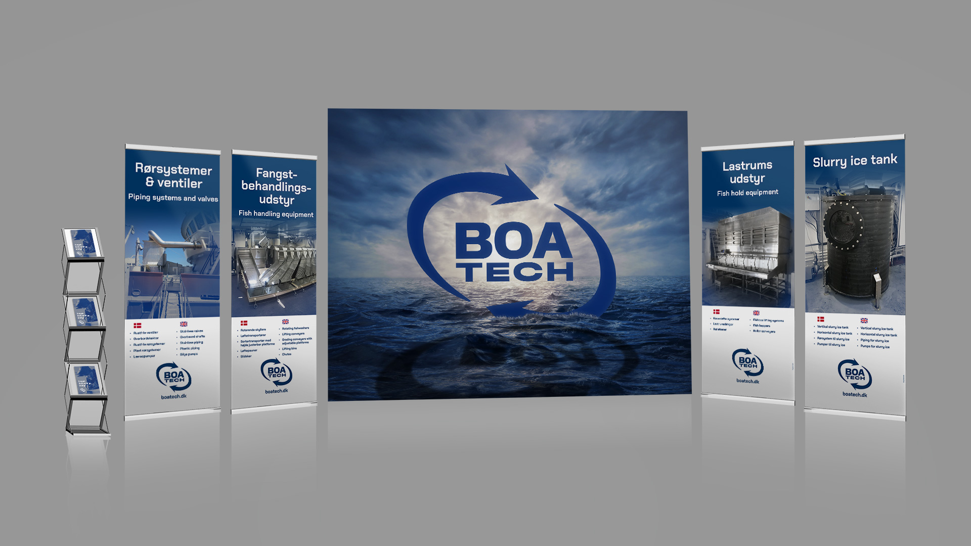 Storformat kan skabe meget opmærksomhed og synlighed for din virksomhed. For BOAtech, der ofte deltager i messer rundt i verden, giver det mening at have noget stærkt genkendeligt og iøjnefaldende materiale. Vi har lavet en stor bagvæg, med logoet i fokus, og roll-ups til nogle af de forskellige områder de beskæftiger sig med. Bagvæggen er fri for tekst, imens indholdet på roll-ups både fremgår på dansk og engelsk – på den måde, kan de bruge materialet i alle lande.