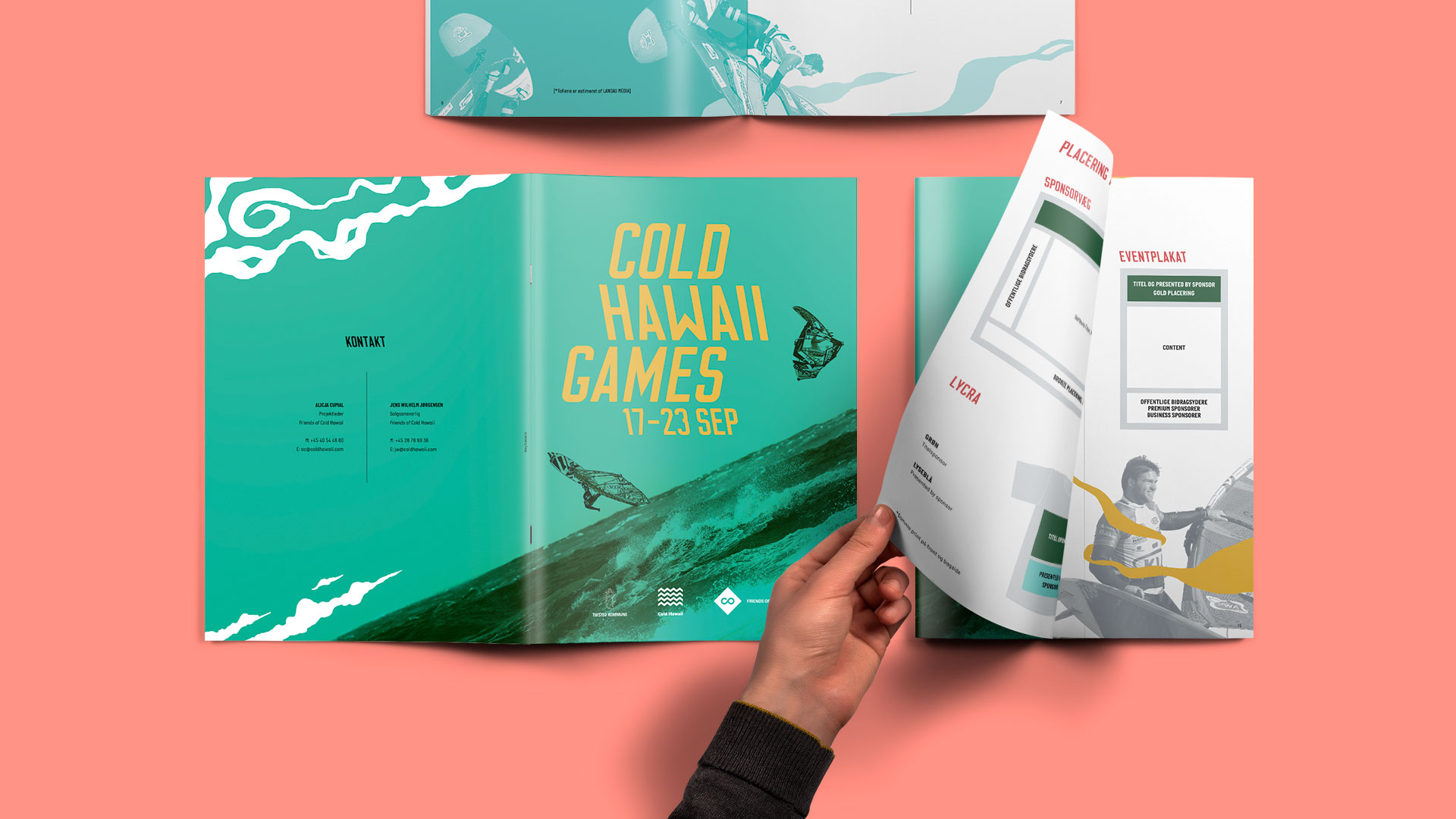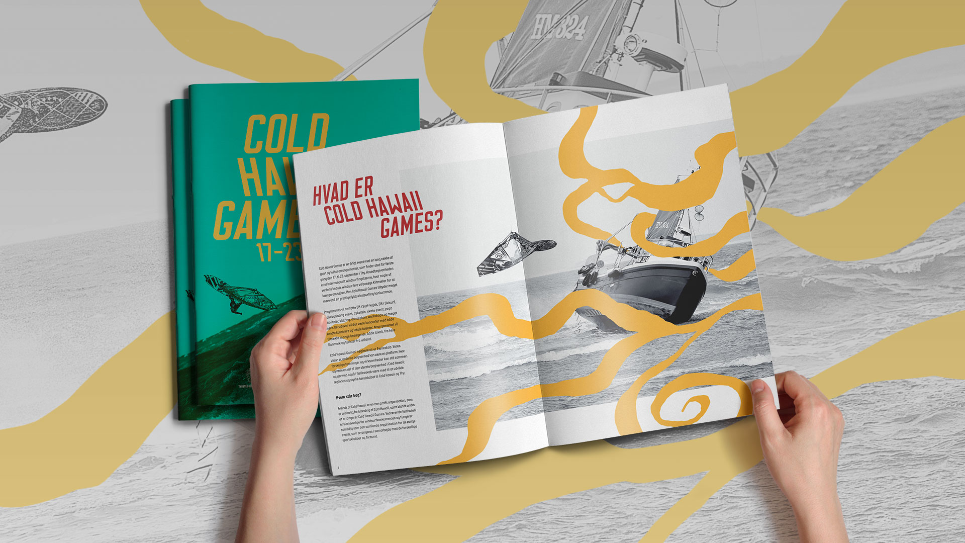 Vi har arbejdet med en displaytypografi, som er både Italic og Reverse Italic, dvs. en typografi som svajer til både højre og venstre. Dette giver typografien en skarp kant, og associationer til Cold Hawaii logoet. Sammen med den håndtegnede, organiske og grænseløse supergrafik, symbolisere disse grafiske virkemidler, naturlige elementer som vand og blæst, samt et overnaturligt element - at der findes noget stærkere og større end os. Det er på samme tid med til at give den visuelle identitet et legende stilsprog.