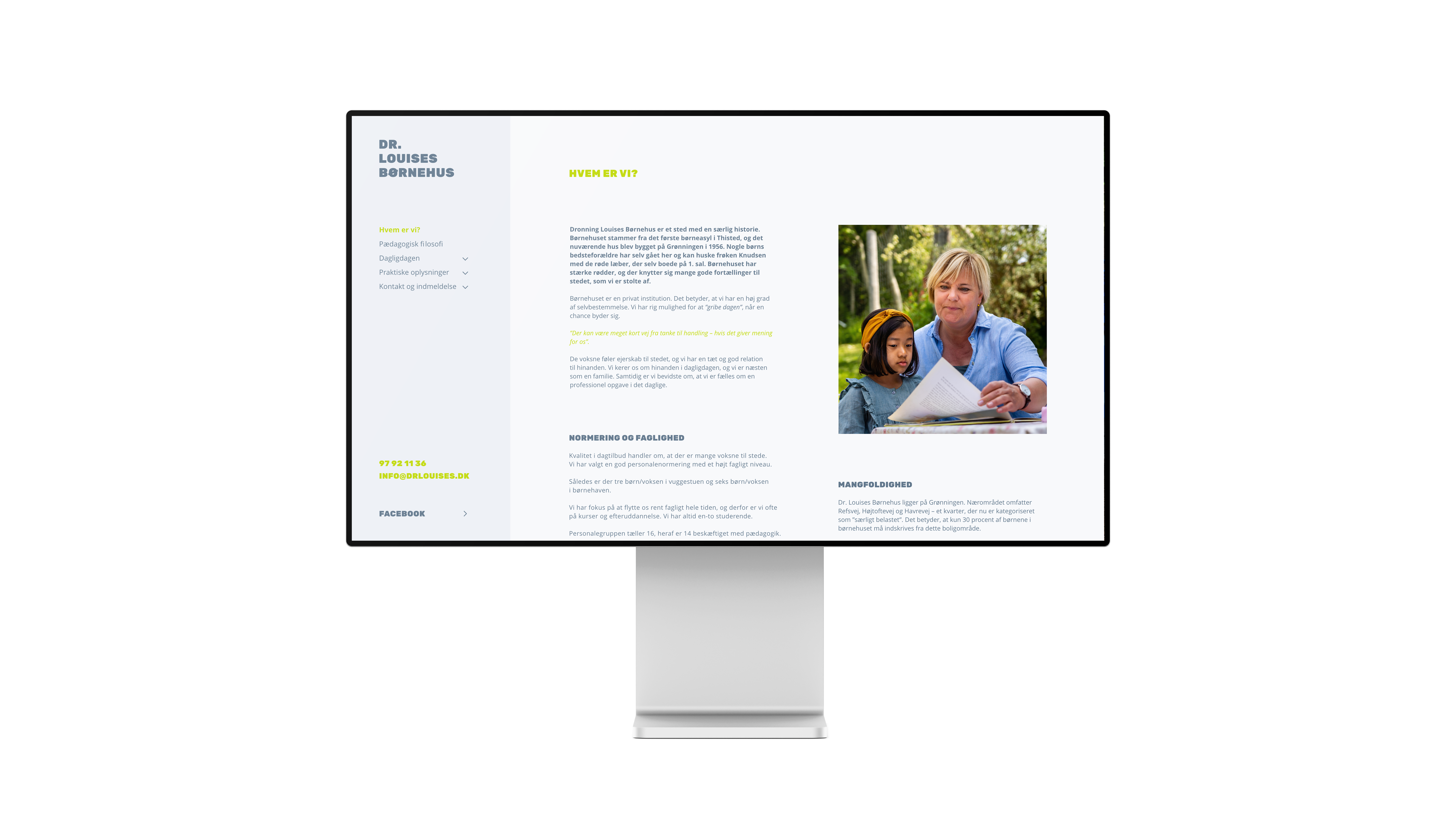 Dr. Louises nye site er nutidigt og friskt i sit udtryk. Nye billeder af dagligdagen i og udenfor huset samt et nyt defineret farveunivers er med til, at puste liv i den historiske daginstitution.
