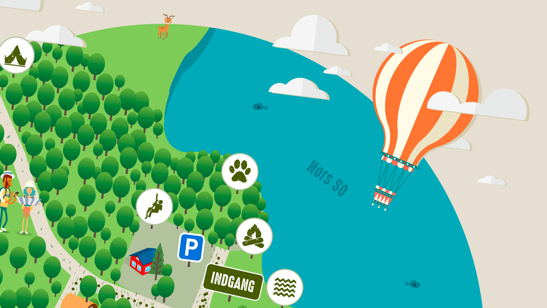 En klassisk sjov detalje med forlystelsesparker er selvfølgelig et oversigtkort over områdes muligheder og forlystelser. Det er altid noget som børn sætter stor pris på, så derfor har vi naturligvis også designet et godt oversigtskort til Vildmarksdagen. Modsat andre oversigtskort, strækker denne infograf sig over et stort geografisk område i Nationalpark Thy, og er i mange områder åbent for offentligheden. Det har derfor besværliggjort muligheden for at blive meget detaljeret. Vi har dog fundet plads i naturen til sjove illustrationer, så som ægteparret der ikke kan finde vej, motionsløberen og naturligvis et af tidens store samtale emner, ulven.